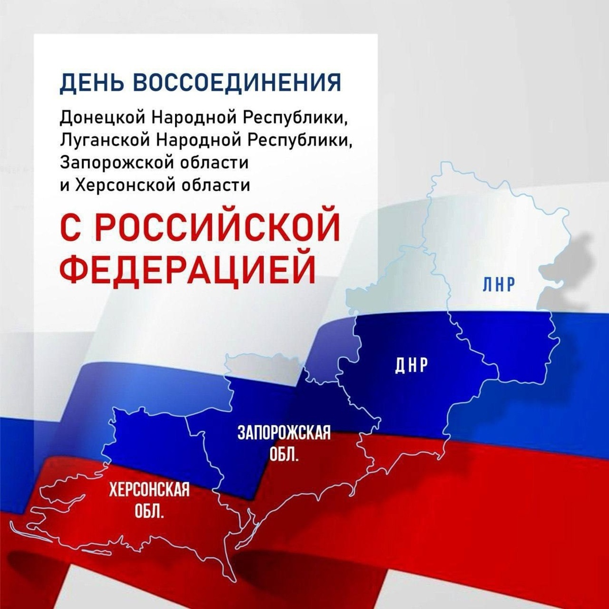 30 сентября - День воссоединения Донецкой Народной Республики, Луганской Народной Республики, Запорожской области и Херсонской области с Российской Федерацией! ⚪️ Сегодня мы отмечаем День воссоединения с Россией Донецкой Народной Республики, Луганской Народной Республики, Запорожской области и Херсонской области. Это историческое событие произошло ровно два года назад — 30 сентября 2022 года были подписаны соответствующие договоры. Президент Российской Федерации Владимир Владимирович Путин предложил установить 30 сентября День воссоединения России и ДНР, ЛНР, Запорожской и Херсонской областей. 28 сентября 2023 года Президент нашей страны подписал закон, согласно которому устанавливается День празднования воссоединения новых регионов с Россией. Изменения вносились в Федеральный закон «О днях воинской славы и памятных датах России». Мы встречаем третью годовщину этого поистине исторического события - возвращения исконных российских земель, наших соотечественников в родную гавань. С