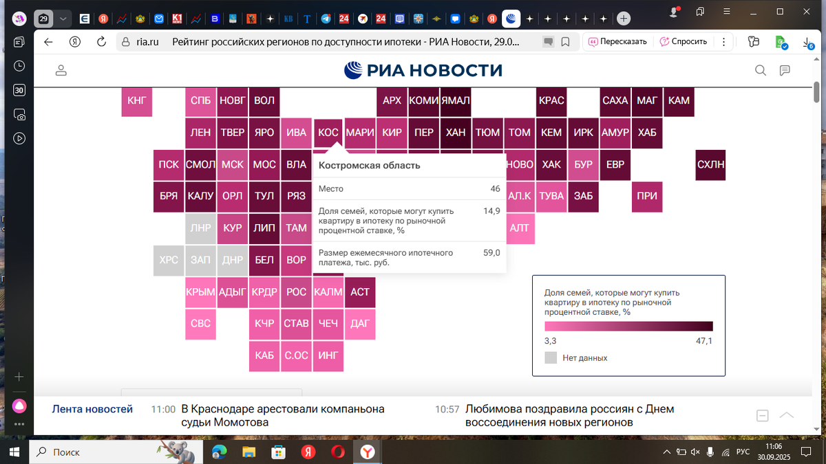 РИА Новости опубликовало рейтинг регионов по доступности ипотеки, Костромская область в списке на 46-м месте Согласно исследованиям, позволить взять ипотеку на рыночных условиях могут только 14,9 % костромских семей, а средний размер ежемесячного платежа приближается к 60 тысячам рублей. Лидером по доступности ипотеки эксперты назвали Ямало-Ненецкий автономный округ. Там почти половина семей могут позволить себе долгосрочный заем на покупку недвижимости. Как говорят цифры, из ближайших соседей дела с ипотекой обстоят лучше у Вологодской области, она находится на 22-месте с показателем 19,7% семей, а также у Ярославской — 32-е место рейтинга с цифрой 17,9% доли семей с возможностью оплачивать кредит на жилье. А вот Кировская область с показателем в 13,4% семей занимает 59 место, а Ивановская — 69-ю позицию.