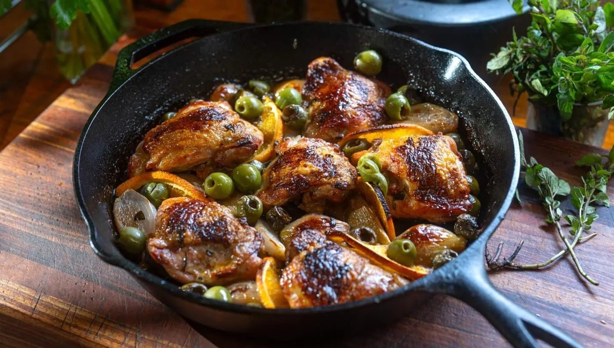 Этот рецепт собрал в себе все лучшие оттенки вкуса: цитрусовую свежесть, пикантность и травяные нотки. Цедра апельсина создает насыщенный аромат, а зеленые оливки гармонично сочетаются с белым вином, чесноком и луком-шалот в золотистом соусе. Простое, но яркое блюдо. Подавайте с запеченным картофелем или хрустящим хлебом. Время подготовки — 10 минут, время приготовления 40 минут. Разогрейте духовку до 180°C с конвекцией. Куриные бедра посолите и поперчите с обеих сторон. В сковороде на среднем огне разогрейте оливковое масло. Обжарьте чеснок в масле в течение 30 секунд до появления аромата, затем выньте и отложите в сторону. Положите курицу кожей вниз и обжаривайте 3 минуты до золотисто-коричневого цвета. Переверните и обжаривайте нижнюю часть ещё 1–2 минуты до золотистого цвета. Влейте в сковороду белое вино, тушите 1–2 минуты, пока объем не уменьшится вдвое. Добавьте куриный бульон. Верните чеснок в сковороду. Разложите вокруг курицы порезанный пополам лук-шалот, дольки апельсина, це
