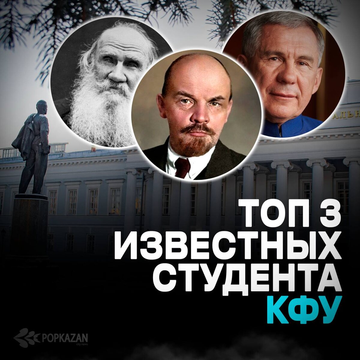 В КФУ училось много известных личностей мирового значения. Сегодня мы познакомим Вас с тремя из них 🚩 Выпуск 1995 Минниханов Рустам Нургалиевич глава Республики Татарстан уже более 10 лет. Пожалуй самый медийный татарин современности и один из самых обсуждаемых политиков России 🚩Выпуск 1877 (бросил уник) Лев Николаевич Толстой один из наиболее известных русских писателей и один из величайших в мире писателей-романистов 🚩 Выпуск 1887 (отчислен) Владимир Ильич Ленин. Самый известный российский революционер, крупный теоретик марксизма. Его бюстом украшен абсолютно каждый город России Наш telegram-bot про Казань