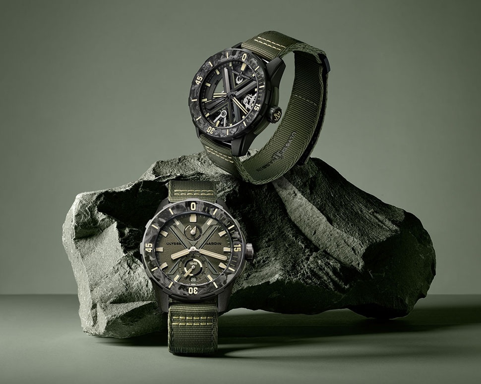 Швейцарский производитель часов Ulysse Nardin в 2024 году выпустил дайверские модели часов Diver NET OPS по цене $13300 и Diver X Skeleton OPS по цене $27500, которые продолжили концепцию дизайна тактической цветовой гаммы в черном и хаки-зеленом цветах моделей Freak OPS (OPS — сокращение от Operations) 2023 года и представлені на сайте SwissChrono.ru. Diver NET OPS основана на базовой конструкции стандартной модели Diver NET 2020 года. 44 мм корпус с многослойной конструкцией изготовлен из нержавеющей стали и композитного материала, состоящего из Nylo и Carbonium. Однонаправленный безель с вогнутой вставкой из карбона обрамляет циферблат с куполообразным сапфировым стеклом. Завинчивающаяся задняя крышка и заводная головка с двумя прорезиненными защитными накладками цвета хаки в положении 3 часа обеспечивают водонепроницаемость до 300 м. Циферблат с пескоструйной обработкой цвета хаки дополнен крупным рельефным центральным символом X с сатинированной отделкой. Под отметкой 12 часов на