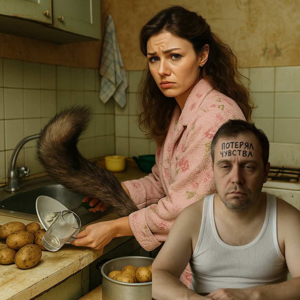 Да-да, хвост. У героини — щель в спине и хвост. Это не метафора усталости или выгорания, это буквально часть тела. Видимо, чтобы читатель точно понял: всё серьёзно, мы здесь не просто о быте, мы о скандинавской мифологии в коммунальной кухне. Вы ждали драму? Получите хульдру с похмельем.