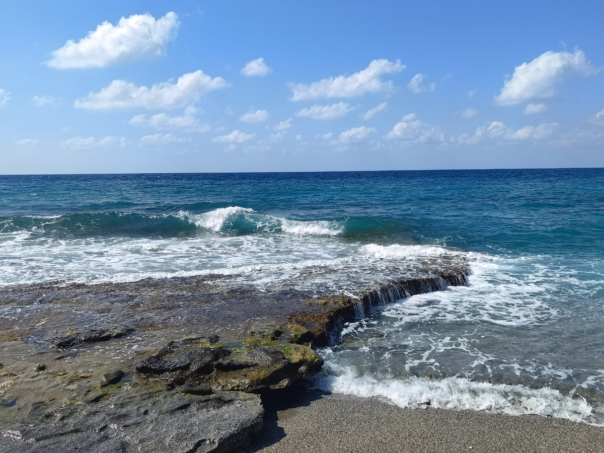 Где плоские камни на берегу - волны были сильнее, где галька и купались все, волны были немного слабее.