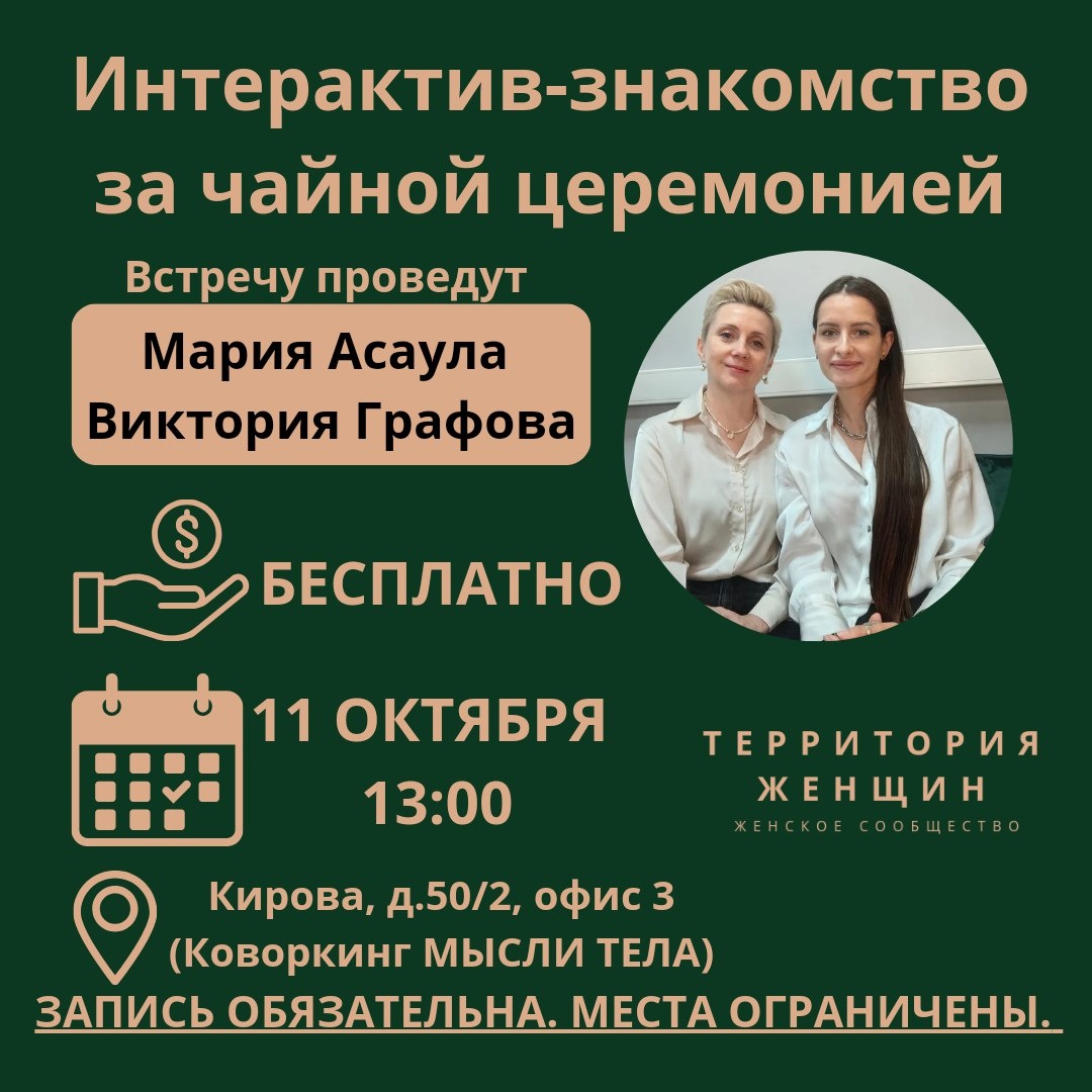 ✨ Интерактив-знакомство с чайной церемонией ☕ 😍Приглашаем вас на уникальное мероприятие, где вы сможете познакомиться с интересными людьми в уютной атмосфере чайной церемонии! Это отличная возможность завести новые знакомства, насладиться ароматным чаем ☕ и провести время в приятной компании💟. ❗Важно: запись обязательна, количество мест ограничено. Запись: пишите ▶️https://t.me/womensrealm или ▶️https://t.me/asaula 📆 11.10.2025 🕒 13:00 🏢 Коворкинг "МЫСЛИ ТЕЛА" 📍 г. Подольск, ул. Кирова 50/2, 2эт, оф. 3 💰 Вход свободный❗️ #женскоесообщество #женщинывместе #женщиныподольска #знакомство #поддержка #общение #провестивремя ⭐Поддержать канал голосом 💰 Вакансия - курьер в Подольске ✅ Мероприятия Подольск https://dzen.ru/id/66ed500f7b5671493eca3fd6 http://vk.com/podolsk_events http://dzen.ru/podolsk_events