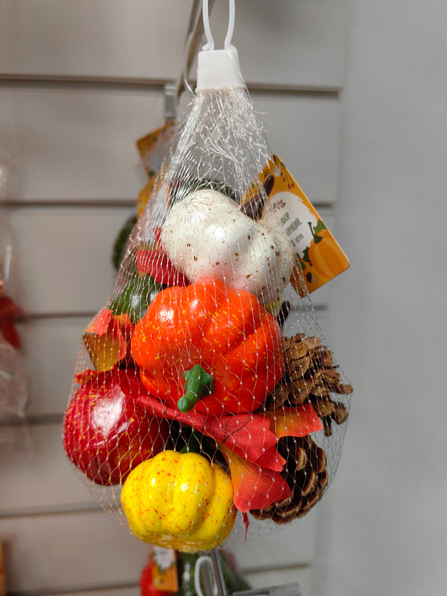 Декорация за 149р, в сетке тринадцать фигурок, шесть из которых тыковки, остальное шишки и листья.
