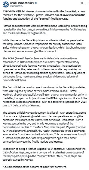 Israel claims it has 'FOUND' an official document in Gaza proving Hamas funds and operates the Sumud aid flotilla