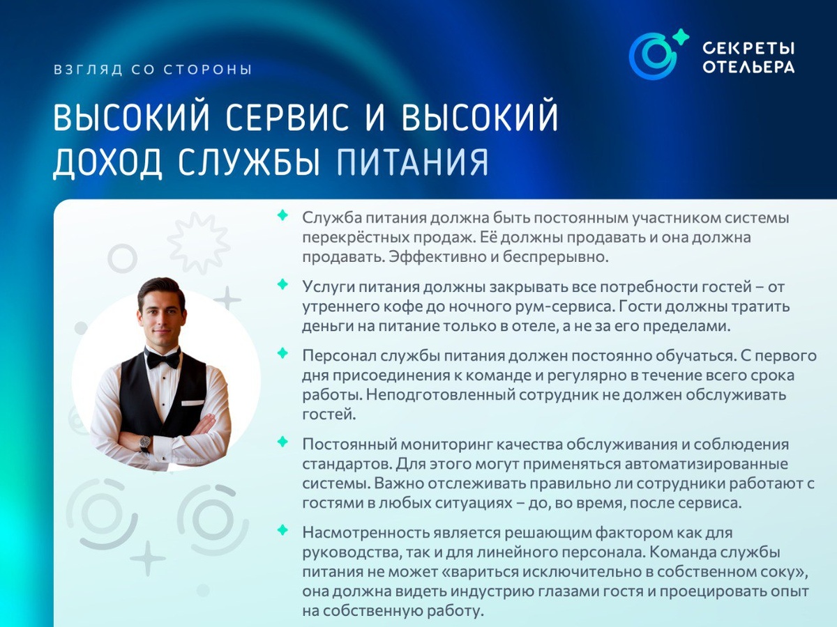 F&B - доход или сервис? В августе мы делали серию публикаций о различных службах отеля и пытались ответить на простой вопрос: что они приносят - доход или сервис? Мы уже поговорили о housekeeping, guest relations, отделе продаж и даже инженерной службе. Сегодня очередь службы питания. И тут вроде бы всё прозрачно: F&B отвечает сразу за оба направления. Высокий сервис и высокий доход - формула простая, но далеко не всегда выполнимая. Мы собрали независимый взгляд со стороны: что помогает сделать эту задачу реальностью. Эфэндбишники, подключайтесь в комментариях - расскажите, где уравнение чаще ломается: в сервисе или в доходе?