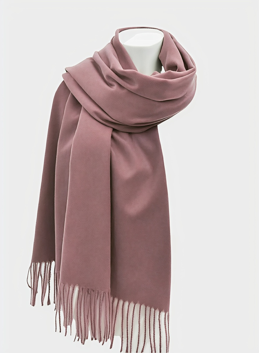Один яркий акцент — бордовый, изумрудный или тёплый розовый. Этот шарф сразу оживляет простые комплекты.