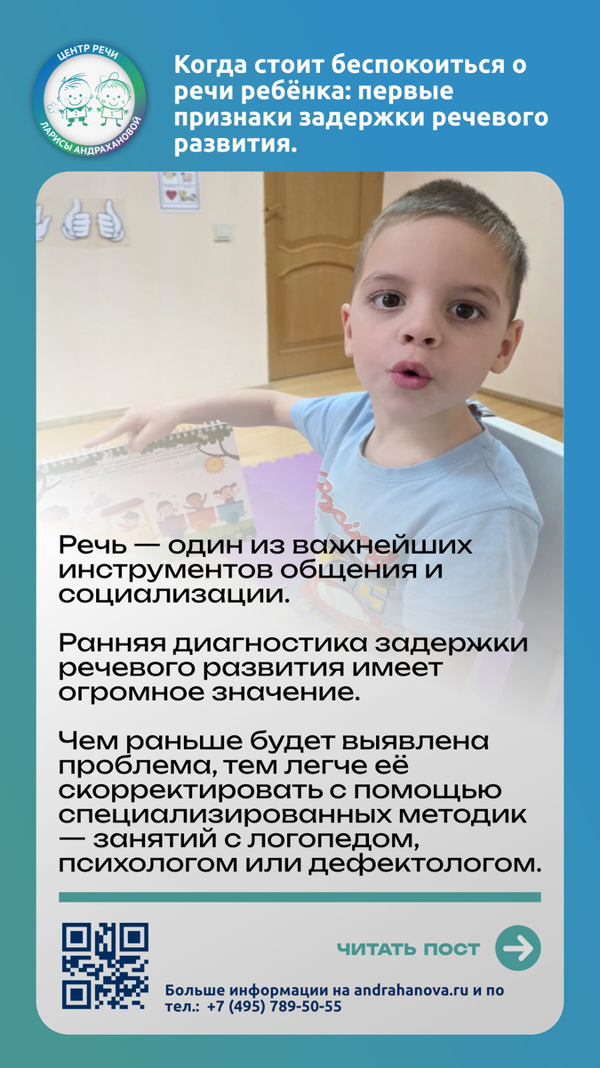 Речь — один из важнейших инструментов общения и социализации. Ранняя диагностика задержки речевого развития имеет огромное значение. Чем раньше будет выявлена проблема, тем легче её скорректировать с помощью специализированных методик — занятий с логопедом, нейропсихологом или дефектологом. Признаки, которые могут сигнализировать о задержке речи: Отсутствие лепета в возрасте 6–9 месяцев. Лепет — первый шаг на пути к развитию речи, он включает произнесение простых слогов, таких как «ма-ма», «па-па». Если ребёнок не начинает лепетать к 9 месяцам, это может быть первым тревожным сигналом. Ограниченный словарный запас в возрасте 2 лет. К двум годам ребёнок должен уметь строить простые двухсловные фразы. Если словарный запас минимален или ребёнок совсем не строит фразы, имеет смысл обратиться к специалистам. Непонимание простых инструкций таких как «дай мячик», «возьми игрушку». Не откликается на имя, часто бесцельно бегает, нет игровой деятельности это признаки задержки в развитии речи. Р