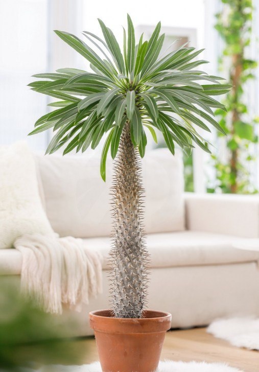 🌿 Пахиподиум — эффектный суккулент с толстым, часто ребристым или каудексным стволом (зависит от разновидности), напоминающим небольшую пальму, на макушке которой сидят узкие, зеленые листья. Это растение привлекает внимание своей необычной формой и экзотическим, даже слегка «кактусовым» обликом, идеально подходящим для современных интерьеров и минималистичных композиций. Пахиподиум предпочитает яркий солнечный свет, умеренный полив с просыханием почвы, а также тёплые условия и низкую влажность. Для посадки используйте тесные горшки и хорошо дренированные субстраты. Это неприхотливое растение отлично подходит для тех, кто любит экзотику с минимальными усилиями по уходу, и станет стильным акцентом на подоконнике, столе или в коллекции суккулентов.