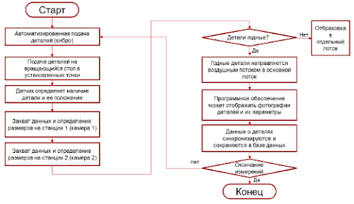Данный цикл повторяется без участия человека. Требуется лишь загружать детали для измерений в резервуар и разгружать измеренные.