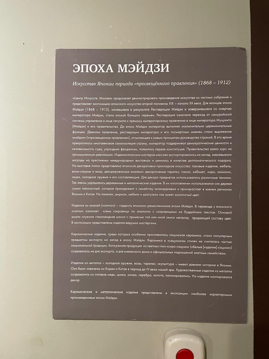 В Центре искусств представлена экспозиция японского искусства эпохи Мэйдзи (1868 – 1912), ставшая для японцев эпохой больших перемен, поскольку означала переход от самурайской системы управления к прямому императорскому правлению в лице императора Муцухито (Мэйдзи). Девизом правления стало выражение «мэйдзи» («просвещенное правление»), отсылающее к новым принципам руководства страной. На выставке представлено японское декоративно-прикладное искусство: керамика, изделия из металла и эмалей, мебель, вазы-сацумы и другое искусство. Изделия японских мастеров широко экспортировались, завоевывали награды на престижных международных выставках и ценились в качестве сувениров и подарков. Посмотрите, есть любопытные работы. Еще о Центре искусств можно прочитать здесь: