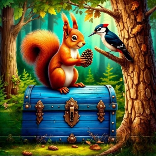 Ну вот, сегодня нет луны. За облако ушла она. Сложнее вить ночные сны, Когда не шлёт свой свет луна. Вода в озёрах не блестит, И звёзды будто сами спят. Петлёю путается нить, Слова спускаться не хотят. Какой узор из слов пойдёт В такую ночь – не угадать. Вольётся новое в узор? Мне, автору, нельзя сказать. Важнее нить мне сохранить, Пускать по линии стежки, И ритм в стежок тугой свой влить. Без звёзд, луны – узлы тонки. Стоял в кустах большой сундук, Замок на нём висел огромный. В ушах Ероха слышал скрежет, стук. Вдруг писк, Ерошка вздрогнул. Прыжок! С мохнатой ветки на сундук Спустилась белка, в лапах шишка. Так вот откуда громкий стук! «Привет! Как жизнь, братишка?» Ероха в ступоре стоит, Мычит, не понимает. «М, со мною белка говорит». Волнение Ерошки нарастает. А белка занята кедровой шишкой, Уселась на большой сундук. «Чего молчишь, братишка? Не бойся ты, не враг я – друг! Тебе сундук открыть же надо, Ключа-то нет, не раздобыл. Дары природы, друг мой, рядом, Иди орехи грызть, чего з
