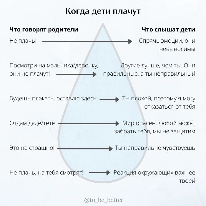 💧 Какие сигналы подают родители, утешая плачущего ребенка? Мы все когда-то были детьми. И знаем, каково это - плакать, чувствовать боль, страх или обиду… и слышать в ответ: «Не плачь!», «Посмотри на других - они не плачут!», «Это не страшно!». Но вот что важно понять: Дети не плачут, чтобы нас раздражать. Они плачуют, потому что им больно - эмоционально, физически, психологически. И когда мы говорим: 🔸 «Не плачь!» → ребёнок учится прятать эмоции, считая их «неправильными». 🔸 «Посмотри на мальчика/девочку - они не плачут!» → он начинает думать: «Я хуже других. Я неправильный». 🔸 «Будешь плакать - оставлю здесь» → ребёнок чувствует: «Ты плохой — я могу тебя отвергнуть». 🔸 «Отдам дяде/тёте» → мир становится опасным, а любовь — условной. 🔸 «Это не страшно!» → он учится игнорировать свои чувства, потому что «нельзя так чувствовать». 🔸 «Не плачь - на тебя смотрят!» → его эмоции становятся второстепенными по сравнению с мнением окружающих. 💔 Плач - это не каприз. Это язык, которы
