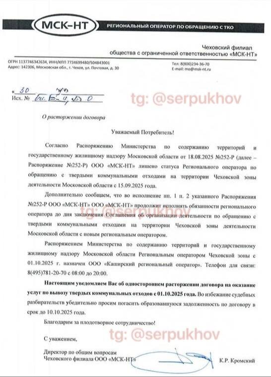 Большой Серпухов получает нового мусорного оператора с пересмотром тарифов С 1 октября в Чеховском кластере (в него входят Серпухов, Чехов, Протвино, Пущино, Подольск и районы) прекращает работу ООО «МСК-НТ», выполнявшее обязанности регионального оператора по обращению с отходами с 2019 года. Новым оператором назначено ООО «Каширский региональный оператор». Именно с этой компанией жителям и предпринимателям Большого Серпухова предстоит заключать новые договоры на вывоз отходов. 📌 Важно: тарифы у нового оператора отличаются. 🙂«МСК-НТ»: 1175,76 руб. за кубометр для населения. 🙂«Каширский регоператор»: 1229,24 руб. за кубометр. Однако, согласно распоряжению комитета по ценам и тарифам Московской области № 320-Р от 20.12.2024, уже в 2026 году запланировано снижение (!) стоимости до 1170,94 руб. за кубометр. Ранее предприниматели и жители округа неоднократно жаловались на перебои в работе «МСК-НТ». Теперь же внимание приковано к новому оператору: по информации от бизнеса, у компании
