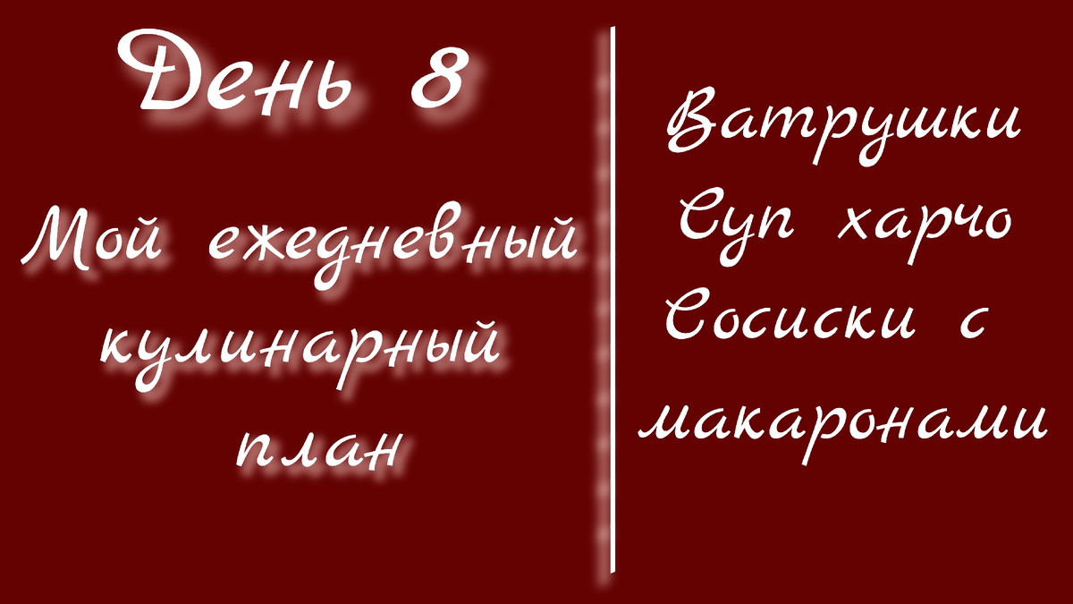 Доброе время суток! Рада приветствовать вас на своём канале "Живем по меню". Сегодня у нас восьмой день нашего кулинарного приключения. Завтрак На завтрак – ватрушки, которые остались ещё со вчерашнего дня. Детям к чаю я подала шоколадку, чтобы начать день с приятного настроения. Чуть позже сделала ролл. Я тебя слепила из того что было😅 Обед На обед решила приготовить суп харчо – блюдо, которое давно не готовила. В его состав вошли мясной бульон, картофель, рис, и классическая поджарка из лука, моркови, помидоров и томатной пасты. Не обошлось без ароматных специй, чеснока и острого перца, которые придали супу насыщенный вкус. Обед сегодня согрел душу и тело — горячий суп харчо с хрустящим хлебом. Этот густой, насыщенный суп с ярко выраженной острой ноткой идеально передаёт атмосферу осеннего холодного дня. Такой харчо — не просто еда, а настоящий праздник вкуса, который особенно ценен в промозглую погоду. Ужин На ужин всё было проще: отварила макароны с сосисками. Также у нас