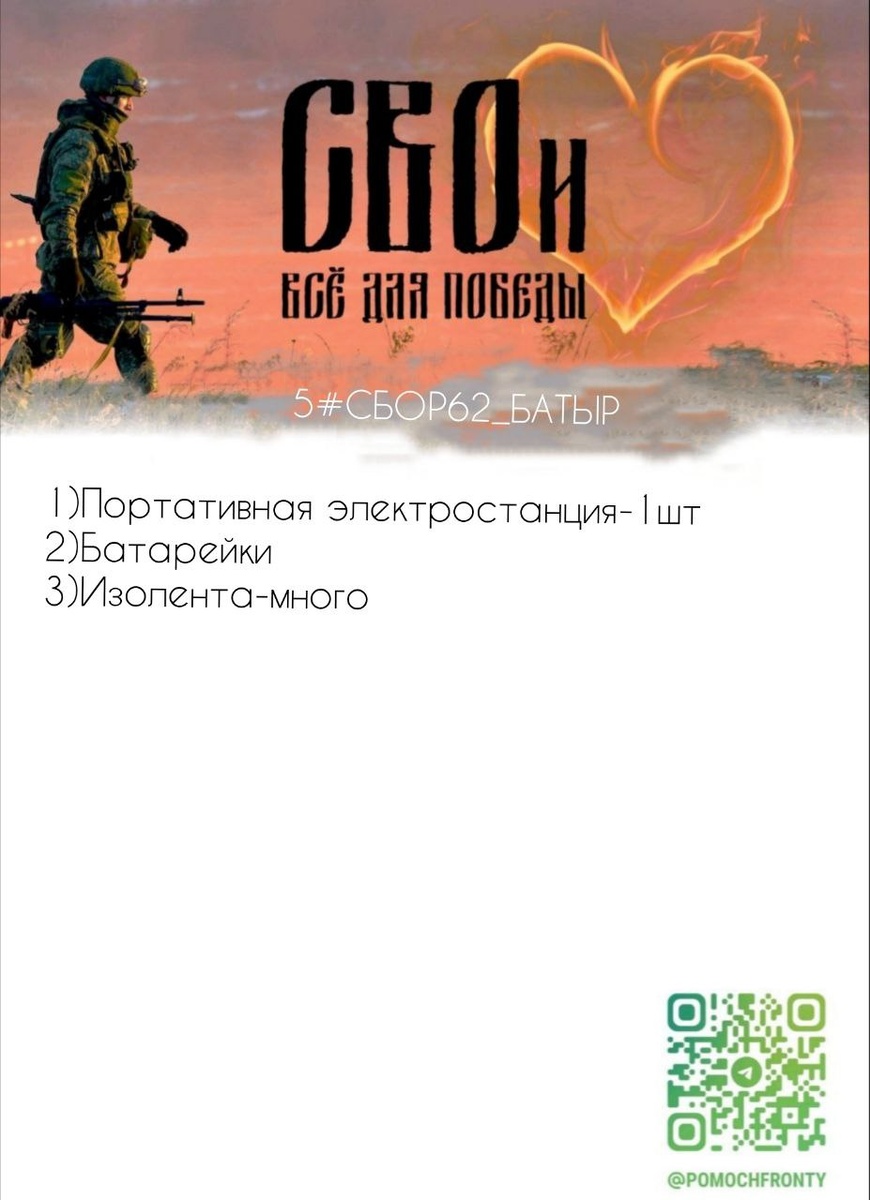 5️⃣ый Октябрьский сбор 🚨 😶😶😶😶😶 🔋 БАТЫР: Новички с Константиновского направления ждут энергии от СВОих! Наши новенькие 🐣 — ребята с позывным БАТЫР — уже в работе на раскалённом Константиновском направлении. А там без энергии — как без рук. Поможем им оставаться на связи и в строю! Нужно простое, но важное: ▫️ Портативная электростанция — чтобы техника не молчала ▫️ Батарейки — для всего, что должно работать ▫️ Изолента — скрепляет не только провода, но и удачу 😉 Дадим БАТЫРу сил — он уже делает невозможное возможным! В этом посте есть большое видео, которое не загрузилось в Дзен. Откройте оригинал поста в телеграме, чтобы его посмотреть