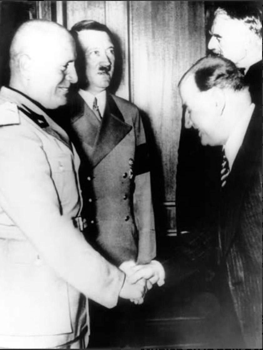 На фото премьер-министр Франции Эдуар Даладье пожимает руку Бенито Муссолини, на втором плане стоят рейхсканцлер Германии Адольф Гитлер и премьер-министр Великобритании Невилл Чемберлен.