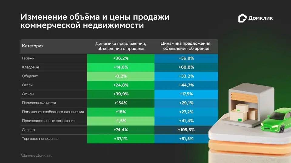 • В продажах лидируют парковочные места (+154%), склады (+74%), офисы (+40%), торговые помещения (+37%) и гаражи (+36%).
