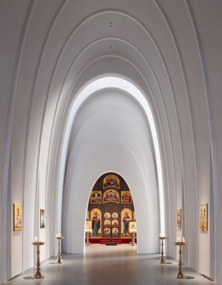 Арх бюро ABOVE представило проект православного храма. «…Основой для пропорций послужили первичные геометрические фигуры — квадрат, круг и треугольник. Они символизируют землю, небесное и божественное начало, становясь каркасом, на котором строится вся композиция. В традиционном древнерусском зодчестве есть такой элемент как закомары. Это килевидные или полукруглые завершения наружных стен, повторяющие очертания сводов за ними. Закомары связывают стены с купольным завершением и формируют выразительный силуэт храма. В нашем проекте этот мотив переосмыслен: закомары превращаются в градиент полукруглых форм. Такая трактовка усиливает вертикальное движение композиции и подчёркивает устремлённость всего храма к небу.» Православный храм, как правило, отождествляется с византийской роскошью и величием, либо с, почти утраченным, русским зодчеством. Такой…минимализм что-ли, немного необычен. Вызывает интерес. Для небольшого прихода или в подходящем месте, может быть в парке «Краснодар».