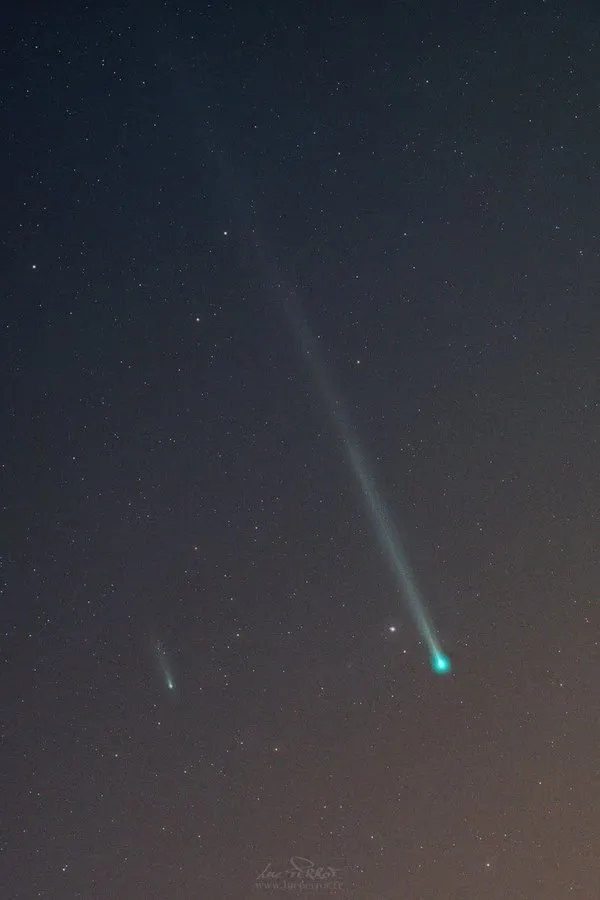 Иллюзия погони: кометы ATLAS и SWAN в одном кадре. Этот впечатляющий снимок, сделанный с французского острова Реюньон, запечатлел редкое визуальное сближение двух комет: Слева — комета C/2025 K1 ATLAS: Приближается к Солнцу. Пика яркости достигнет в начале октября, но, вероятно, останется объектом для фотоаппаратов. Справа — комета C/2025 R2 SWAN (SWAN25B): Удаляется от Солнца. В середине октября, по оптимистичным прогнозам, может стать видна невооруженным глазом с Земли. Несмотря на разное движение, обе кометы демонстрируют классические признаки: зеленоватую кому из газа и ионный хвост, всегда направленный от Солнца.