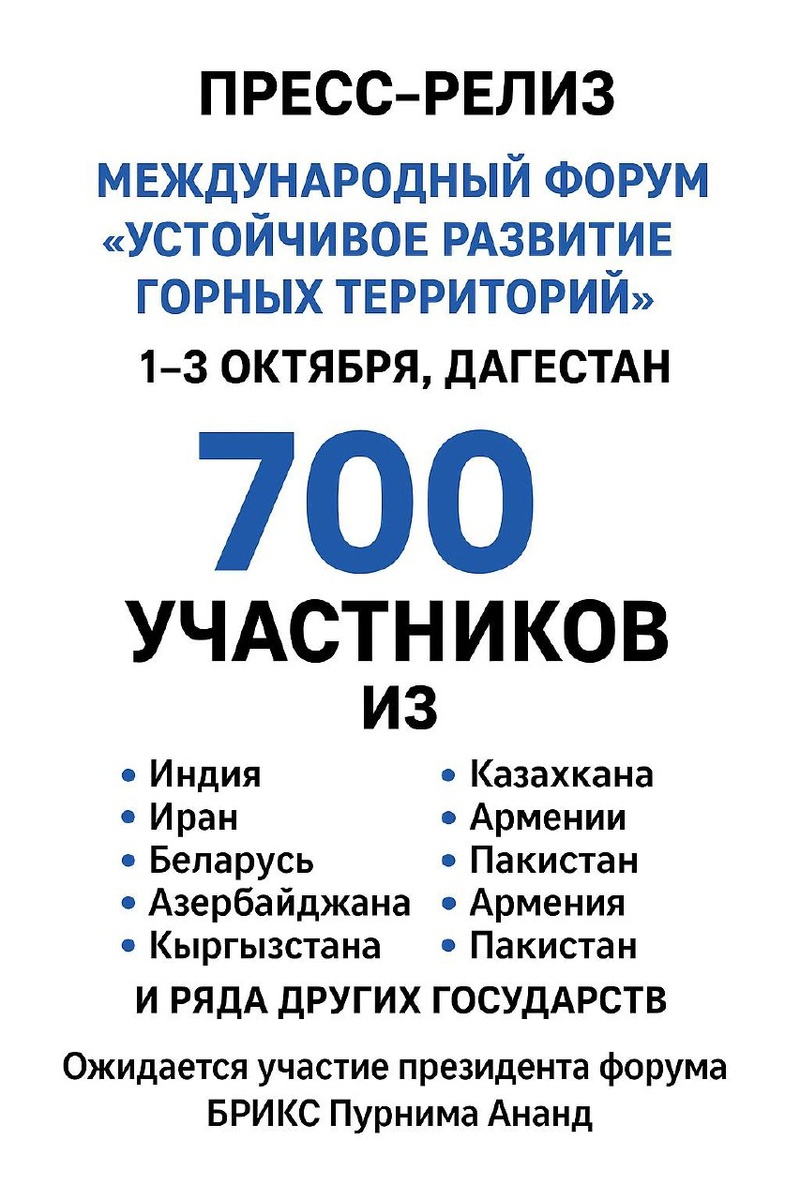 С 1 по 3 октября в Дагестане пройдет Международный форум «Устойчивое развитие горных территорий», который соберет более 700 участников из разных регионов России и зарубежных стран. В числе делегатов — представители Индии, Ирана, Беларуси, Азербайджана, Кыргызстана, Таджикистана, Узбекистана, Казахстана, Армении, Пакистана и ряда других государств. Среди почетных гостей ожидается президент форума БРИКС Пурнима Ананд. В программе форума — более 20 мероприятий: • круглые столы по вопросам развития агропромышленного комплекса, систем водоснабжения и ликвидации последствий ЧС; • панельные дискуссии и заседания рабочих групп; • выставка-ярмарка; • концертная программа; • подписание соглашений. Особое внимание будет уделено внедрению инноваций в сельское хозяйство, развитию отраслевого туризма и цифровизации горных населенных пунктов. В работе форума планируется участие главы Республики Дагестан Сергея Меликова, парламентариев, представителей бизнеса, науки и общественных организаций. От