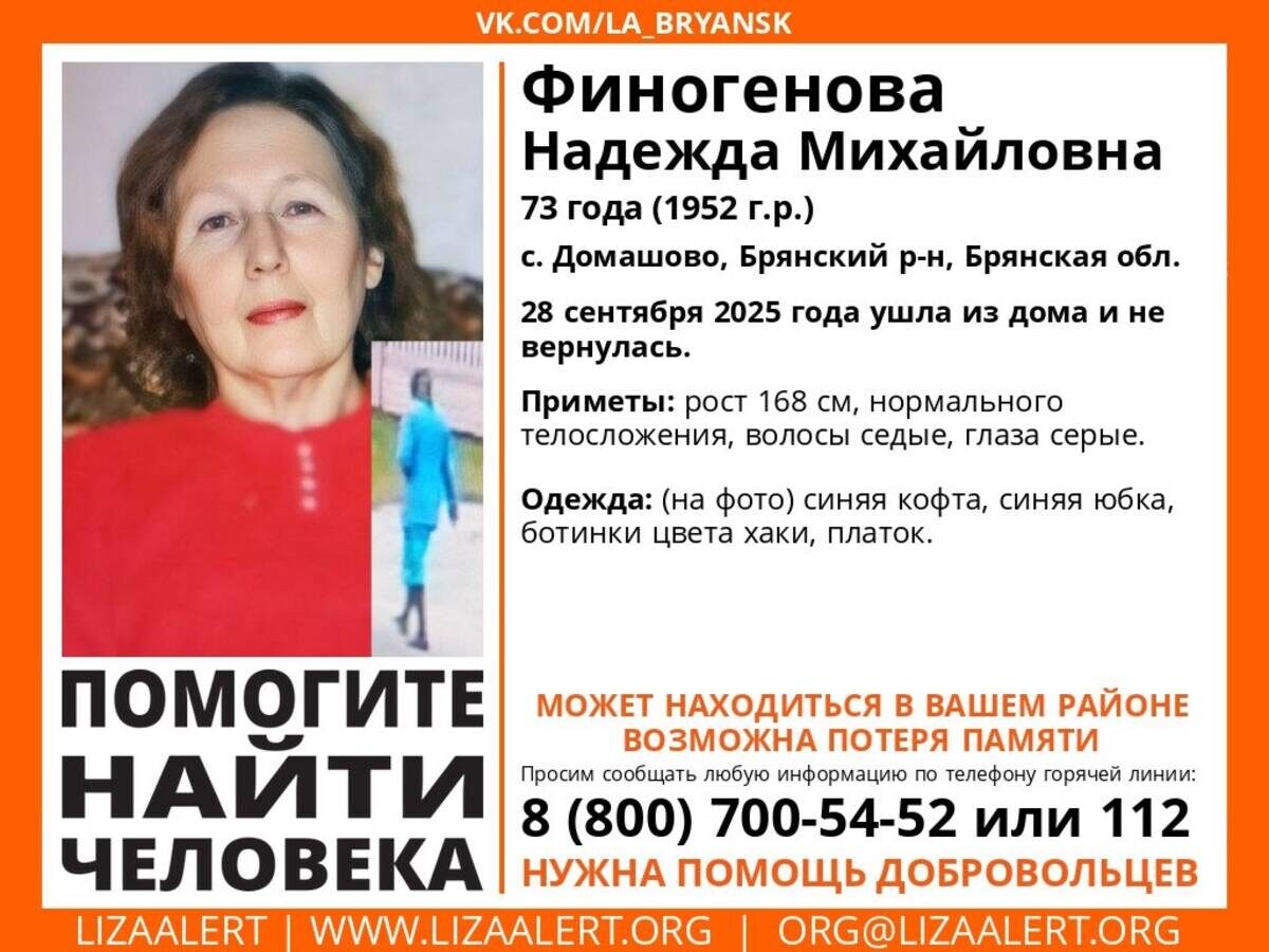 Под Брянском пропала 73-летняя Надежда Финогенова с потерей памяти