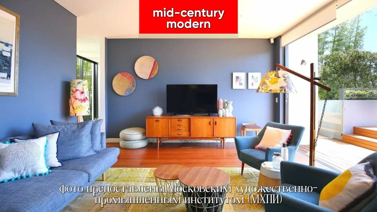 Для mid-century modern характерно сочетание нейтральной базы (бежевый, серый, белый) с яркими акцентами — горчичным, оранжевым, бирюзовым. В советском модернизме преобладали природные оттенки: зеленый, коричневый, охра. Для обоих стилей характерно использование дерева, особенно темных пород, которое привносит теплоту в минималистичное пространство. Ключевой элемент любого послевоенного интерьера — мебель. Диваны и кресла на тонких ножках, журнальные столики обтекаемых форм, стеллажи со множеством отделений — типичные черты эпохи. В советском варианте популярны секретеры и сервант для демонстрации коллекций фарфора и хрусталя, а также книжные полки для обширных домашних библиотек.