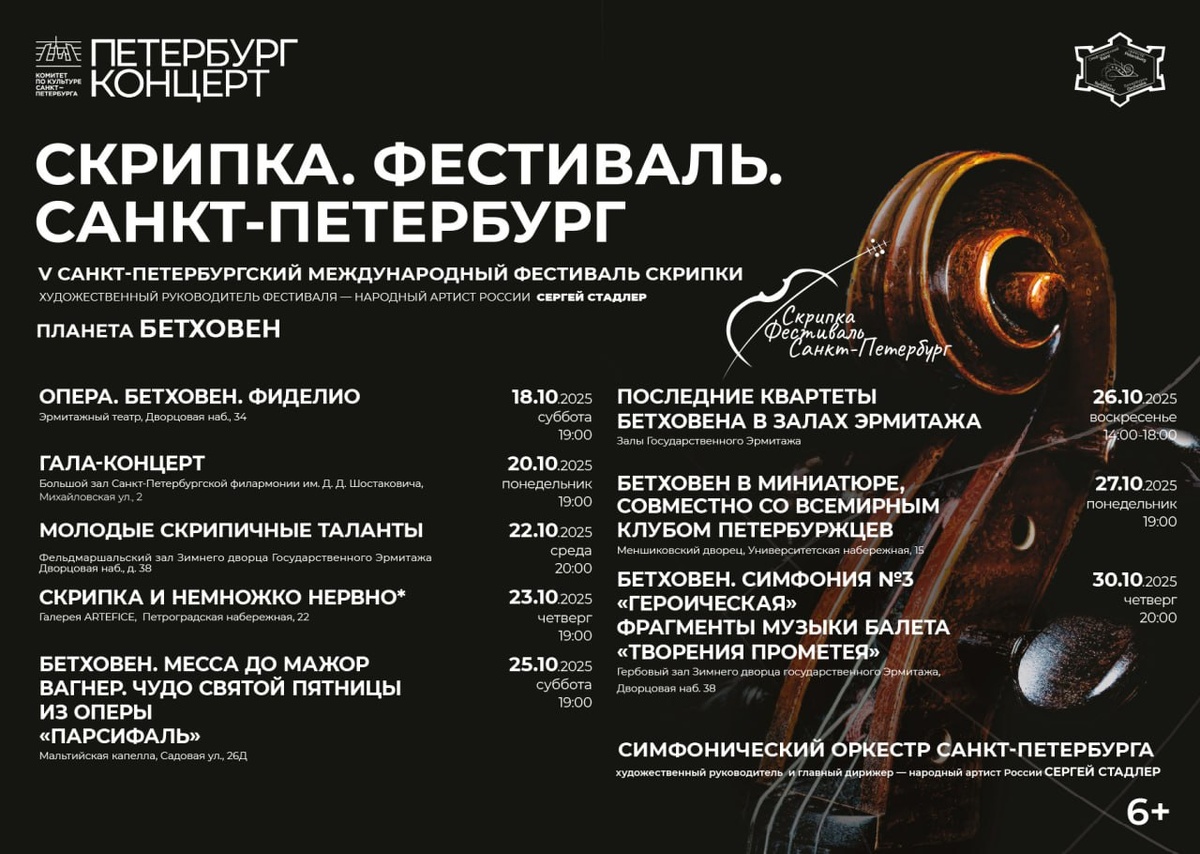 Фестиваль скрипки возвращается в Петербург! В октябре V Санкт-Петербургский международный фестиваль скрипки «Скрипка. Фестиваль. Санкт-Петербург», ставший замечательной традицией Северной столицы, начнет блистательную серию концертных программ. В этом году программа фестиваля посвящена творчеству Людвига ван Бетховена и включает в себя масштабные концерты на лучших площадках города, серию мастер-классов и профессиональную конференцию, посвящённую вопросам скрипичного исполнительства. 18 октября фестиваль откроется спектаклем «Фиделио», созданным специально для Эрмитажного театра по единственной опере великого композитора. 20 октября состоится гала-концерт в Большом зале Санкт-Петербургской Академической филармонии им. Д. Д. Шостаковича. 22 октября традиционная программа под названием «Молодые скрипичные таланты» познакомит гостей с творчеством скрипачей, которые только начинают покорять большую сцену, но уже точно заслуживают вашего внимания. 25 октября в Мальтийской капелле проз