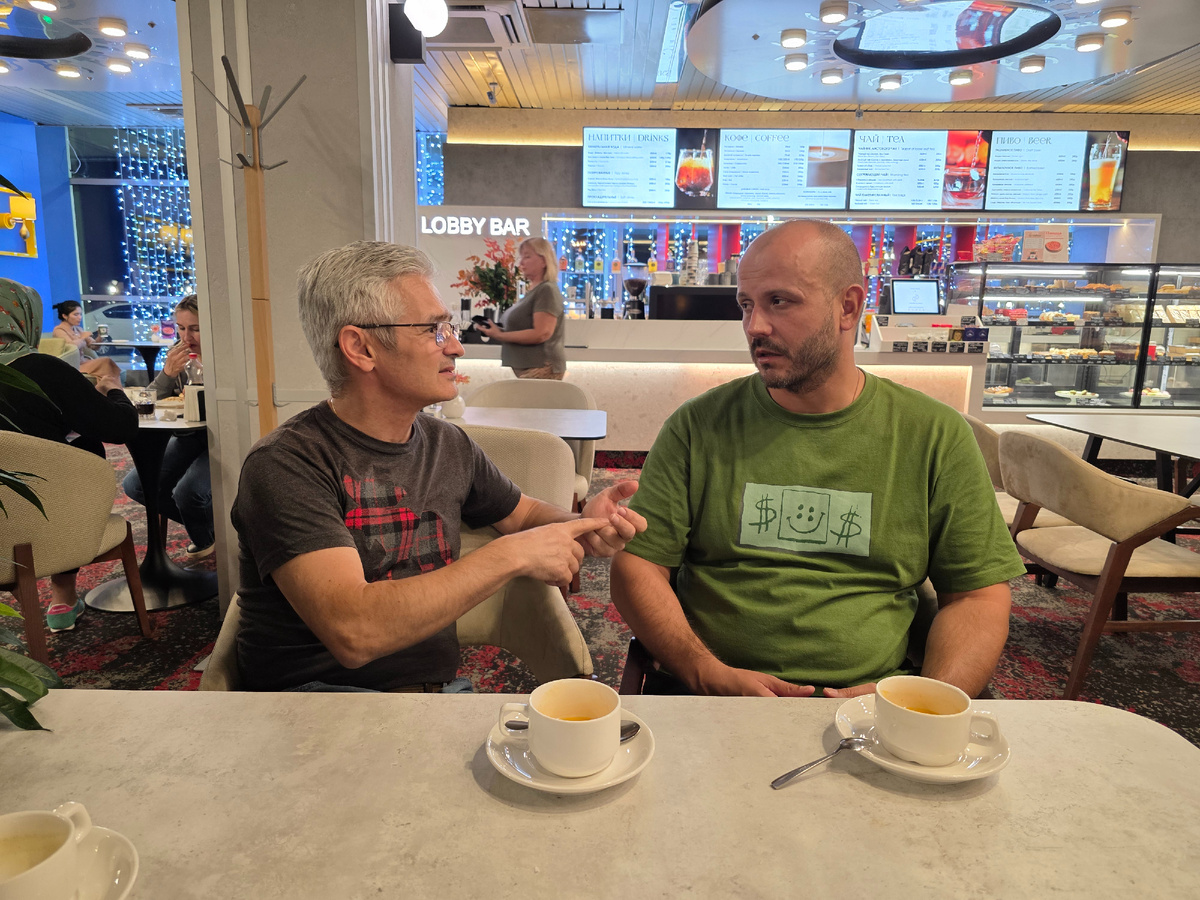 Неожиданные встречи — самые приятные! С журналистом из Сербии Игорем Дамьяновичем мы не раз пересекались в Мариуполе. Так, в прошлом году он приезжал к нам вместе с блогерами далёкой, но близкой Африки - из Мали 🌍. Волею судьбы Игорь снова оказался там же, где и я! 📍 Москва, гостиничный комплекс «Измайлово». Узнав, что Дамьянович также находится в российской столице, решил записать с ним интервью. Пишу Игорю ближе к полуночи: «Как насчёт завтра? Удобно подъехать для интервью в нашу гостиницу?» Он отвечает коротко: «Я тоже в Измайлово». Через 10 минут мы уже сидим в лобби-баре корпуса «Вега», обсуждая планы за чашкой кофе. ☕️ Правда, кофе Игорю мало помогает — перелёты берут своё, но держится он стойко, несмотря на то, что на часах уже за полночь. 🎤 Договариваемся завтра же, примерно в полночь, записать интервью здесь же. P.S. На фото самые внимательные заметят третью чашку кофе 😉 Спасибо за кадр коллеге и соучредителю «Мариупольского телевидения» Оксане Хаджиновой. Как говорится,