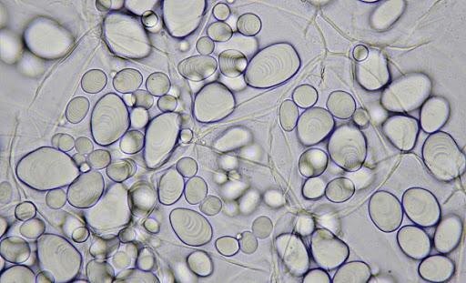 Крахмал всегда встречается в виде зерен той или иной формы, характерной для отдельных растений; значительно варьируют и размеры зерна. Крахмальные зерна имеют слоистое строение; они представляют собою ряд сферокристаллов, слои которых слагаются из тончайших иголочек (трихитов), расположенных от центра радиально наружу. Крахмалообразование связано с деятельностью хлоро-, хромо-и лейкопластов. Крахмал не встречается у грибов, диатомовых, сине-зеленых и бурых водорослей и некоторых других растений. Крахмал как кристаллическое вещество обладает двойным лучепреломлением и в поляризованном свете при скрещенных николях в крахмальных зернах появляется черный крест. При анализах материала на крахмал, помимо химических реакций, следует прибегать к помощи поляризованного света, так как таким путем крахмал можно всегда отличить от прочих включений; кроме того, могут быть случаи, когда материал нельзя подвергнуть обработке соответствующими реактивами.