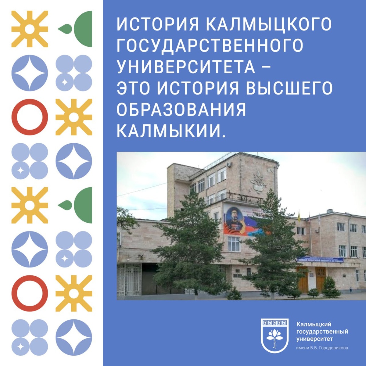 История Калмыцкого государственного университета – это история высшего образования Калмыкии. Мечта о высшем европейском образовании своими корнями уходит к 1920 году, когда на Общекалмыцком съезде Советов было принято решение об «организации Калмыцкого университета как центра, объединяющего и направляющего научнокультурную работу в степи». Понадобились долгих полвека, чтобы мечта воплотилась в жизнь. 1929 год - СНК РСФСР принял решение о создании в 1929/30 учебном году Калмыцкого отделения педагогического факультета при Саратовском университете, куда было принято 30 парней и девушек. 1938 год - открыт учительский институт в Астрахани с историческим и физикоматематическим отделениями. Через год к ним добавилось отделение русского языка и литературы. Большая заслуга Калмыцкого отделения в Саратове, учительского и педагогического институтов в Астрахани в том, что они содействовали формированию первого отряда интеллигенции республики. 1939 год правительство РСФСР удовлетворило просьбу ру