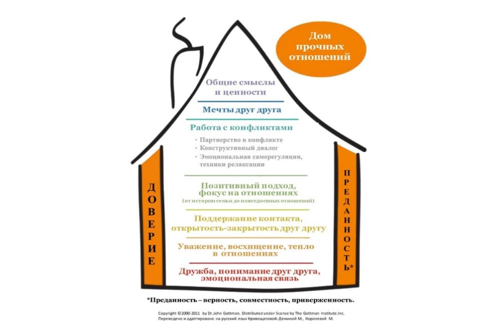 Первое, что нам нужно понять, а что такое любовь? Что именно нужно вернуть? Если мы посмотрим на концепцию хороших отношений, разработанную исследователем Джоном Готтманом, то увидим, что она начинается с понимания друг друга, уважения и восхищения, умения откликаться, навыков разрешения конфликтов, уважения к мечтам и построения совместных целей. А держат все это строение две стены: доверие и приверженность (имеется в виду то, что каждый из партнеров считает отношения приоритетными и не планирует их заканчивать). Почему в случаях, когда надо спасать отношения, не работают или очень криво работают советы про стать покладисто