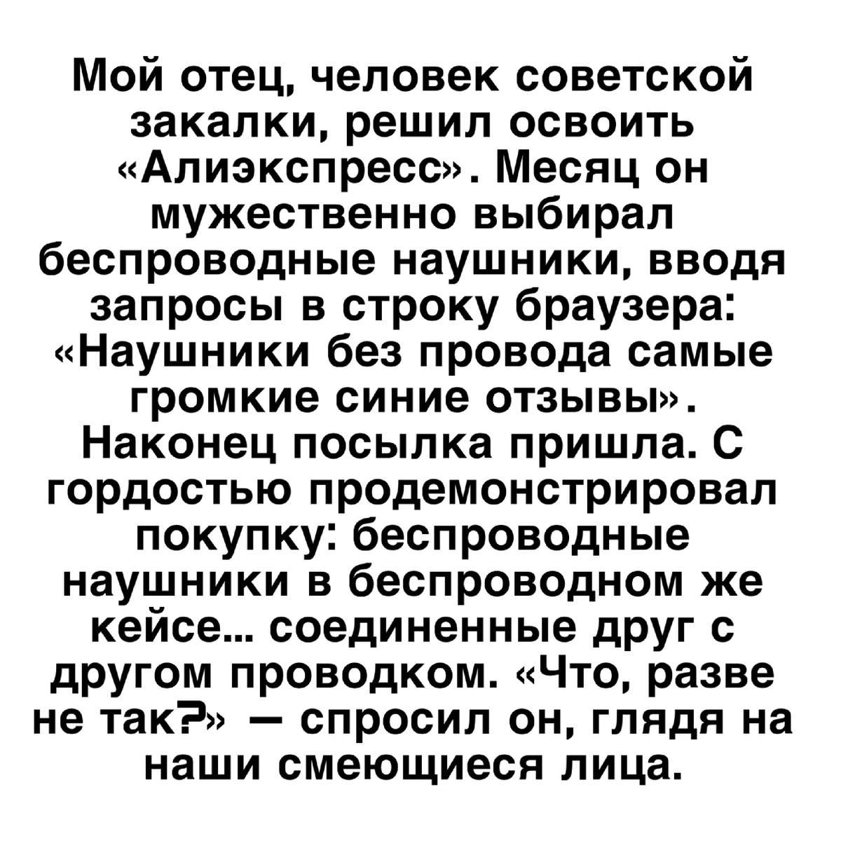 Мой отец, человек советской закалки, решил освоить «Алиэкспресс». Месяц он мужественно выбирал беспроводные наушники, вводя запросы в строку браузера: «Наушники без провода самые громкие синие отзывы». Наконец посылка пришла. С гордостью продемонстрировал покупку: беспроводные наушники в беспроводном же кейсе... соединенные друг с другом проводком. «Что, разве не так?» — спросил он, глядя на наши смеющиеся лица.
