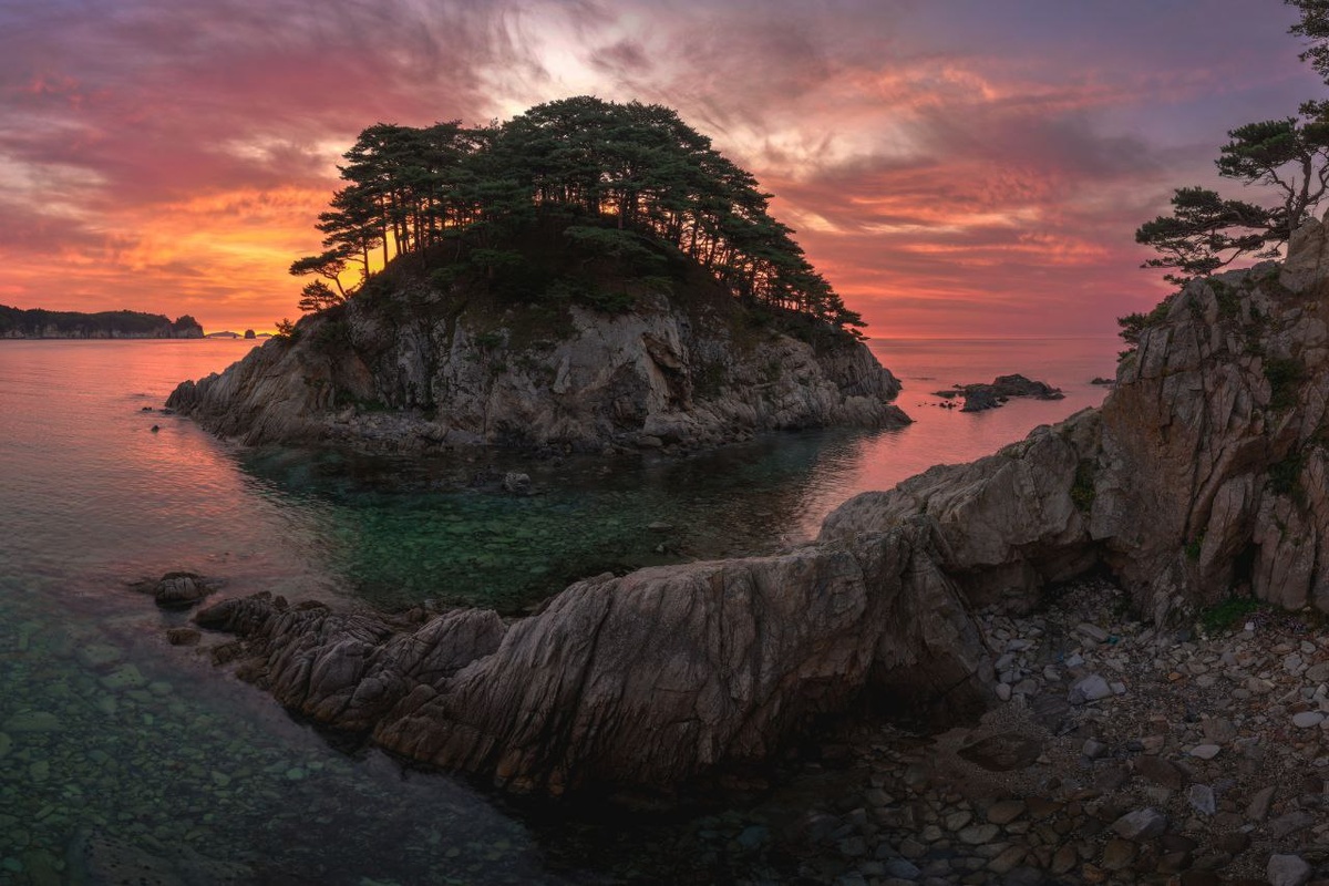 Поднялись на перевал за горой Туманной, с этого я начинаю каждый рассветный выезд, чтобы оценить состояние неба и решить, какая из бухт будет наиболее "рабочей". Увидели, что есть просвет красный на горизонте и рванули в рощу красных японских сосен к острову Томящегося Сердца. Это место полное величия, гармонии и первозданности природы.