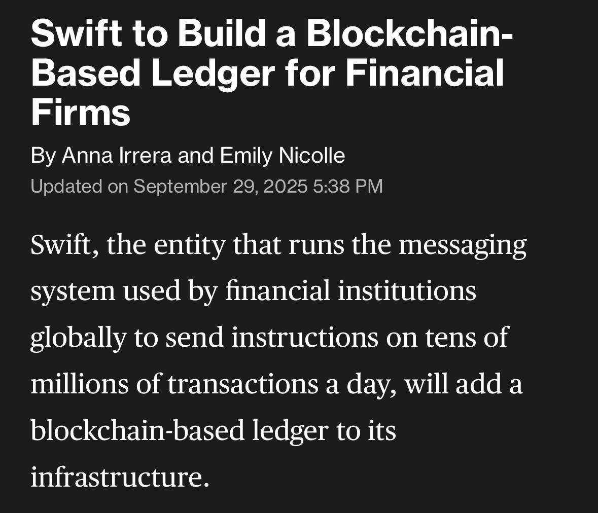 🌐 SWIFT тоже идёт в блокчейн Звучит странно, да? SWIFT - это символ «старых денег», та самая система, через которую банки десятилетиями гоняли переводы по всему миру. И вот теперь они строят собственный блокчейн-реестр. Зачем? 🔹Чтобы ускорить переводы (не дни, а минуты). 🔹Чтобы быть совместимыми с токенизированными активами, стейблкоинами и будущими CBDC. 🔹Чтобы просто не отстать от тренда. Мне кажется, это не революция, а страх остаться в прошлом. Банки понимают, что если не перестроятся, их заменят крипта и мессенджеры вроде Telegram. ❓Интересно, если даже SWIFT признаёт силу блокчейна, то через сколько лет банки перестанут быть посредниками в переводах? Telegram | YouTube