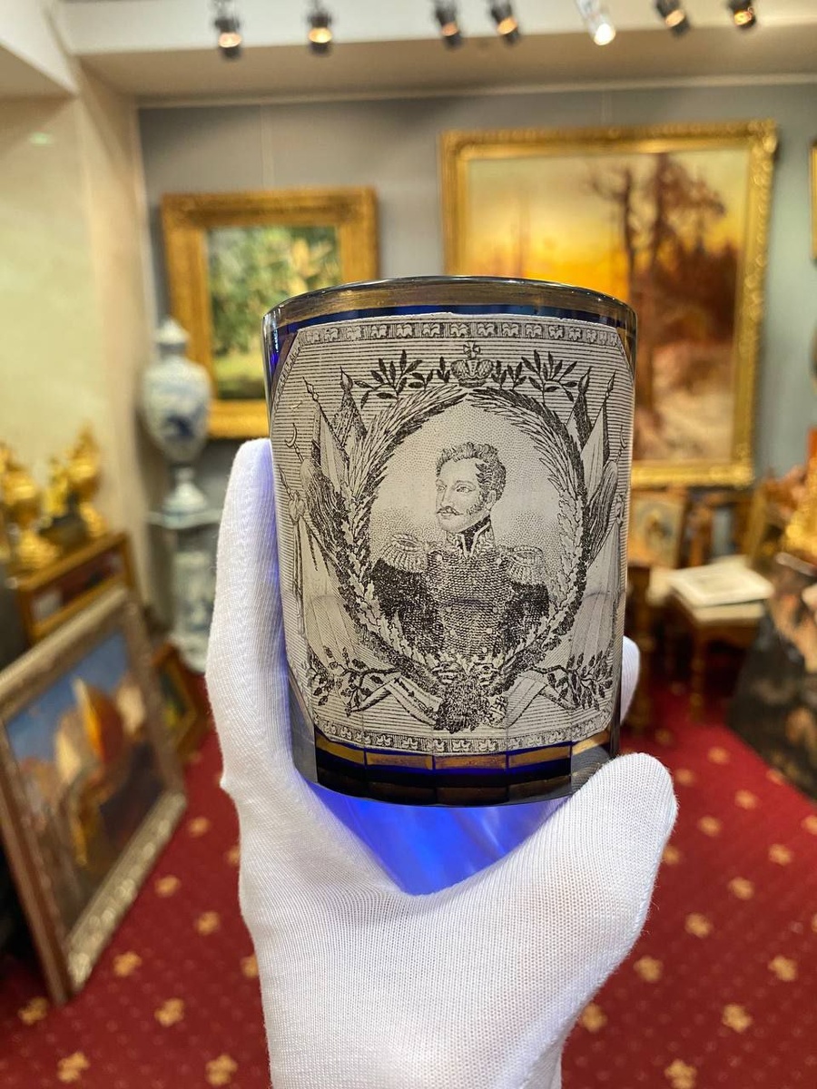 В Государственном Историческом Музее открылась большая к 200-летию вступления на престол императора Николая I выставка. ⚡️ 🔵В «закромах» - у партнера, хранится камерный и интересный памятник той эпохе 👑🍺 Перед вами — парадный стакан, созданный на Императорском стеклянном заводе. Вероятно, он был изготовлен в честь 40-летия Кавалергардского полка в 1839 году, а украшен портретом самого императора, «идеального самодержца», выполненным по оригиналу художника Ф. Крюгера. *️⃣Эта вещь ценна как историей, так и революционной для своего времени технологией. Чтобы безошибочно перенести изображение на коническую рельефную поверхность стакана мастера использовали новую технику декалькомании (деколи). Изображение печатали литографией на особой бумаге с клеевым слоем, и вручную, с ювелирной точностью, переносили на стекло или фарфор. Главный недостаток этого метода? ⬇️ Он до сих пор, как и 200 лет назад, требует кропотливого ручного труда. ❗️ Этот стакан — прекрасный пример того, как передо