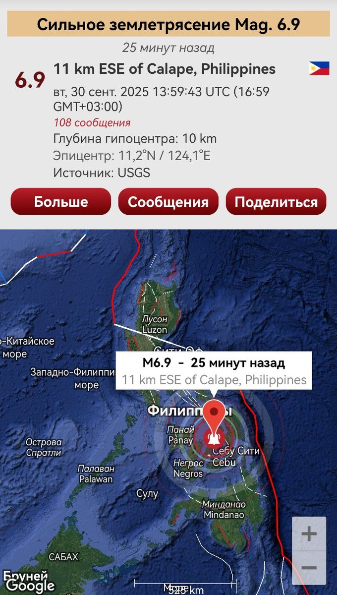 В ответ на пост Филиппины после вчерашнего прогноза долго ждать не стали и влупили на все деньги (М6.9) немного южнее ожидаемой зоны 🤷 Но по магнитуде и срокам попадание 🎯💯 Продолжающаяся магнитная буря Землю тоже не смутила в плане сильной сейсмики. ===== According to yesterday's forecast, an earthquake occurred in the Philippines M6.9