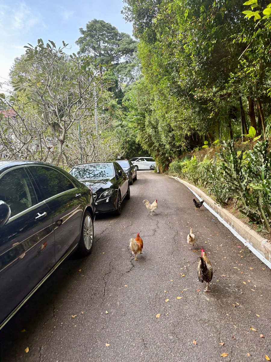 Куры звали нас пойти за ними вперед, мимо деревьев плюмерии, стоящих прямо на краю склона. Мы поднялись вверх, чтобы очутиться возле дома, украшенного китайскими фонариками.