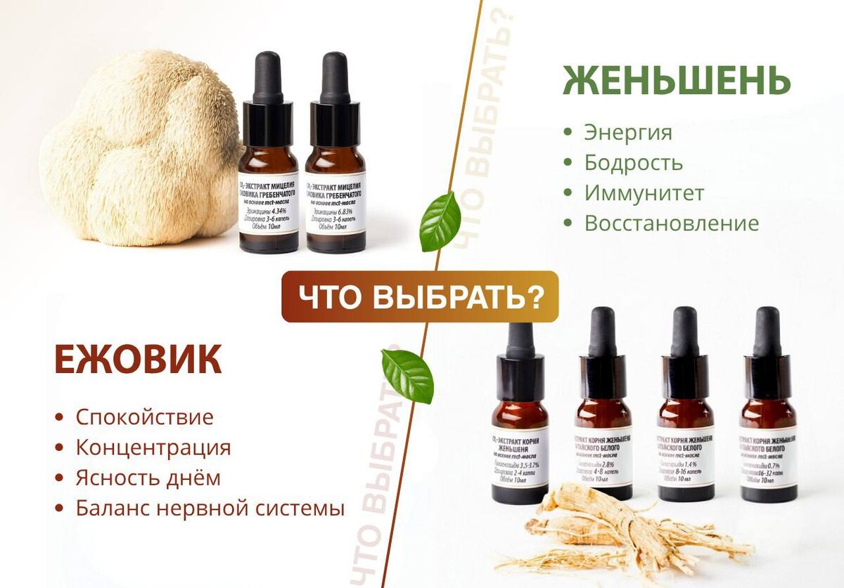 🍂 Что выбрать на осень: женьшень или ежовик? Для начала давайте определимся, а что же основное вас беспокоит: стресс, сложности с фокусом и концентрацией, сонливость, отсутствие энергии и сил или частые простуды и слабый иммунитет? Стресс 🟢Женьшень — поддерживает ресурс, помогает справляться с переутомлением. 🟡Ежовик — способствует спокойствию и устойчивости. Фокус и концентрация 🟢Женьшень — даёт общую бодрость. 🟡Ежовик — помогает сосредоточиться и дольше удерживать внимание. Сонливость днём 🟢Женьшень — даёт энергию без кофеина, мягко и устойчиво. 🟡Ежовик — больше про ясность и собранность в часы бодрствования. Частые болезни 🟢Женьшень — стимулирует иммунитет, полезен при сезонных простудах. 🟡Ежовик — косвенно поддерживает через баланс нервной системы. Нет сил и энергии 🟢Женьшень — первый выбор, когда нужно поднять ресурс. 🟡Ежовик — не «заряжает», но делает умственную работу комфортнее. Когда можно и нужно сочетать? Бывают и такие случаи, например при высоких нагрузк