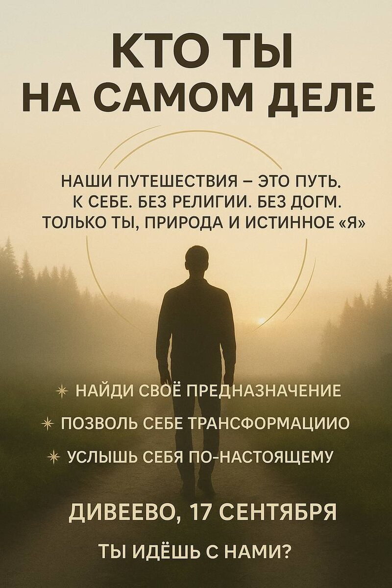 Трансформационный кэмп: Преображение 3.0 ОТРЕЧЕНИЕ ПРОБУЖДЕНИЕ ОТ ИЛЛЮЗОРНОГО СНА 🥰 с 17 сентября 2025 года 🥰с. Дивеево Нижегородской области 🥰Продолжительность - от 2 до 14 дней Ты уже всё знаешь. Ты читал книги. Ходил на тренинги. Пытался «мыслить позитивно». Медитировал. Но почему-то старые демоны всё равно возвращаются. Обиды. Саботаж. Тревога, которая накатывает в 3 часа ночи. Ощущение, что живешь не свою жизнь, будто бы тобой управляют чужие программы. Знакомо⁉️ Потому что ты чистил экран, а не источник сигнала. Ты бился с тенями на стене, вместо того чтобы повернуться к проектору. ❌Хватит это терпеть. Пришло время совершить фундаментальный переворот. Не извне — вовнутрь. Не из состояния Жертвы, которая ждет спасения — в состояние Творца, который его создает. ⚡️Это не тренинг. Это — трансформационный лагерь. Для взрослых, готовых к погружению в свою глубину. ЧТО ЭТО БУДЕТ❔ От 2 до 14 дней тотального апгрейда операционной системы «Я». Мы не будем «работать над проб