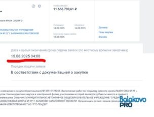 Возбуждено дело в отношении МАОУ «Средняя общеобразовательная школа № 21» города Балаково — закупка № 32515129243 на выполнение работ по текущему ремонту кровли МАОУ СОШ № 21. Цена контракта 11 миллионов 666 тысяч. Разместили информацию о закупке в четверг, 14 августа, в 20:23. Заявки принимались до 4 часов ночи 15 августа.