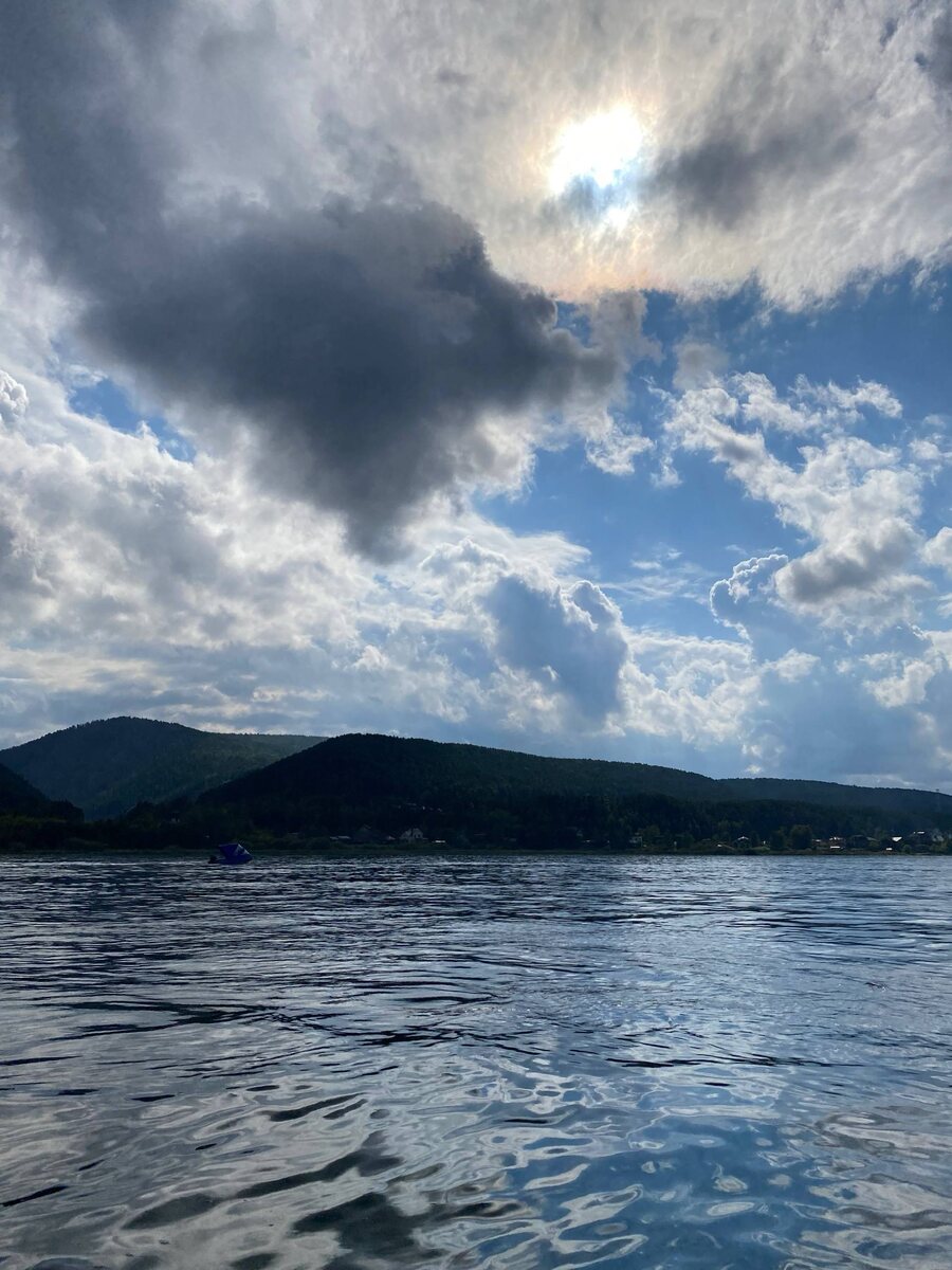 На нашем пути были многочисленные холмы, усеянные мириадами деревьев и уймой скал. Ты движешься по широченному и могучему Енисею, которым впечатлялись великие Астафьев и Суриков. А ещё погода таинственная: небо затянуто тучами, а в кулуарах ютится туман.