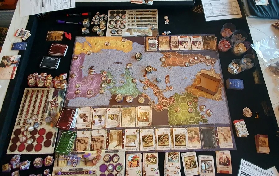 Что здесь есть на поле? Несколько регионов - Галлия, Испания, Италия, Нумидия, Греция,Ассирия и Египет , где вы будете строить свои какие-то поселения, города, возводить порты, чудеса света и как бы вам не казалось странным, но есть такой любопытный момент в игре - вы не привязаны к конкретному региону, стартовому и вообще вы всегда можете строиться где угодно и выставляться где угодно. Выглядит на 1 взгляд это достаточно странно, если не сказать всрато, но в целом, памятуя о том, что многие цивилизации и народности оказались рассеяны (как тут не вспомнить вавилонскую башни) и их следы можно найти в разных географических местах… можно, как говорится, приподзакрыть глаза на этот момент. Важно также следующее. Вот у вас есть поле, которое полнится всякими разными объектами - на нём есть гексы для постройки городов, есть залежи каких-то ресурсов, есть различные уникальные торговые товары, которые можно заполучить, строясь в этом месте. Плюс - все в игре крутится вокруг так называемых «столпов цивилизации» - девяти видов меток - условные гражданские/военные/аграрные/правительственные/научные институты. Эти метки будут являться как условием розыгрыша карт, так и будут учитываться в скорингах и заработке достижений.