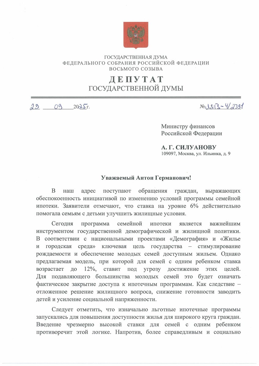 Важно сохранить ставку семейной ипотеки на уровне 6% для семей с одним ребенком. Для семей с двумя и более детьми следует ввести дополнительные пониженные ставки. С такой инициативой вместе с руководителем фракции «Справедливая Россия - За правду» Сергеем Мироновым обратились к главе Минфина РФ Антону Силуанову. ✉️К нам приходят сообщения от граждан, которые обеспокоены тем, что ставку могут повысить до 12% для семей с одним ребенком. Это фактически закроет доступ к льготной ипотеке для многих. Сейчас ставка в 6% дает реальный шанс решить жилищный вопрос. Семейная ипотека — часть национальной политики по поддержке рождаемости и обеспечению жильем. Если мы хотим, чтобы молодые люди не боялись заводить детей, жилье не должно быть недоступным. ⚡️Материнский капитал, региональные выплаты и налоговые льготы начинают действовать с рождения первого ребенка. Ипотека не должна быть исключением. Считаем, что более справедливым подходом было бы оставить ставку в 6% для всех семей с детьми. З