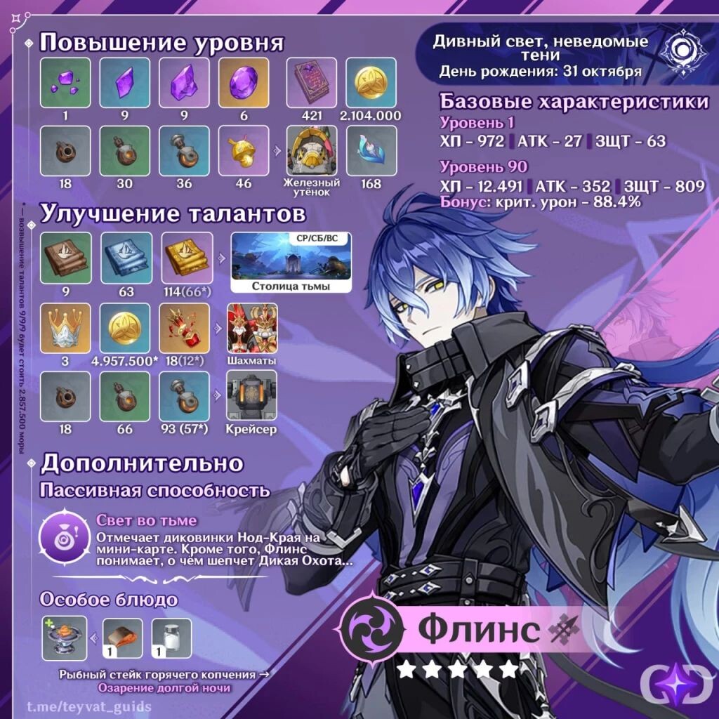 ㅤ🗲 Основной урон Флинса заключается в атаках, которые он наносит, находясь в особой стойке элементального навыка, поэтому его качать стоит в первую очередь. Он должен быть активен всё то время, которое Флинс проводит на поле боя, а также часто применять и вторую его версию.