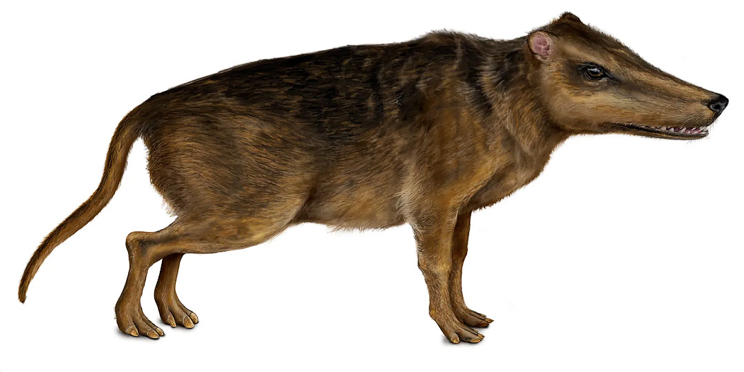 Привет, мои дорогие любители необычной земной фауны. Сегодня мы отправимся в эоцен, когда киты ещё не пели в океанах, а их предки бегали по берегам рек. Наш герой мало чем напоминает современных гигантов моря, но именно он был первым шагом на пути к величественным властелинам глубин. Представьте существо, похожее на хищника: острые зубы, вытянутая морда, длинный хвост. Оно рвёт добычу, скалит клыки и будто создано для охоты. Но стоит взглянуть внимательнее — и привычная картина рушится: на его лапах копыта, а слух уже умеет улавливать вибрации не только в воздухе, но и под водой. Знакомьтесь — пакицет (Pakicetus), одно из древнейших известных звеньев в истории китообразных. Его останки нашли в Пакистане, и именно по этой находке он получил своё родовое имя, которое буквально переводится как «пакистанский кит». Обитал пакицет в начале эоцена, около пятидесяти миллионов лет назад. Его мир — это тёплые берега и реки древнего океана Тетис, влажные тропические ландшафты, где суша и вода пер
