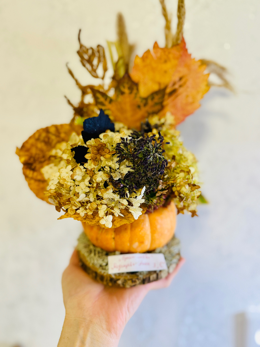 - Установите тыкву на деревянный спил, задекорируйте мхом.