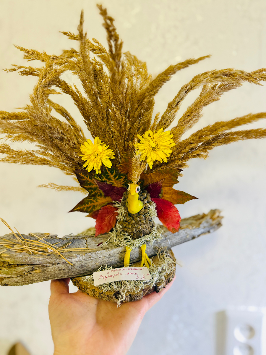 3. Хвост сделала из сухих трав, листьев и жёлтых цветочков.