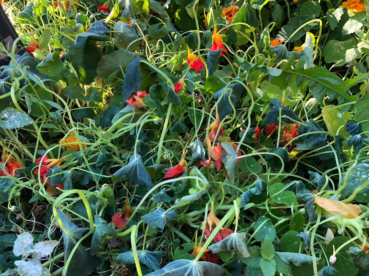 Последний сентябрьский день напомнил нам, что зима уже недалеко. В ночь с 29 на 30 сентября был минус ночью. Утром первыми в глаза бросились поникшие настурции. Но ночной минус побил их выборочно. На одном месте весь цветник выглядит понуро, в другом только верхушки пострадали, а настурции, что спрятались в сорняках, вообще бодро выглядят. Пока не стала выдергивать настурции, собрала немного их семян. Переживаю за водный гиацинт, его прихватил заморозок. Низкие плюсовые температуры он выдерживал, но вот минус повредил часть листьев. Водокрас вроде нормально перенес эту ночь. Аир уже давно начал желтеть, буду позже вытаскивать и делить. Эйхорнию вытащила, оказалось, что она "задушила" одну молодую нимфею. Пустила корни в горшок с ней и вытеснила полностью. Водный гиацинт настолько хорошо врос в горшок с нимфеей, что вытащила его оттуда не без труда. На зимовку в дом я ранее взяла побег, большее количество не хочется заносить, мало места. Но возникла идея попробовать новый способ зимовки